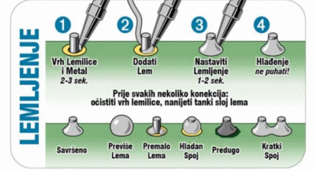 Na slici 2 je dat postupak formiranja zalemljenog spoja, kao i šematski prikaz dobrog i loših lemova