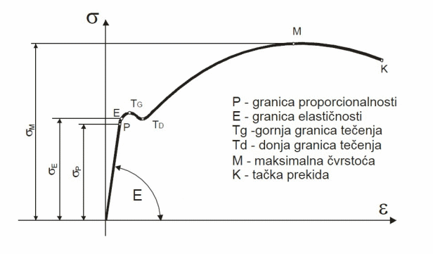 Plastična zona: Nakon dostizanja granice tečenja, materijal ulazi u plastičnu zonu, gde se javljaju ireverzibilne (trajne) deformacije. Naponi mogu rasti do maksimalne čvrstoće M, nakon čega dolazi do loma i materijal pukne.