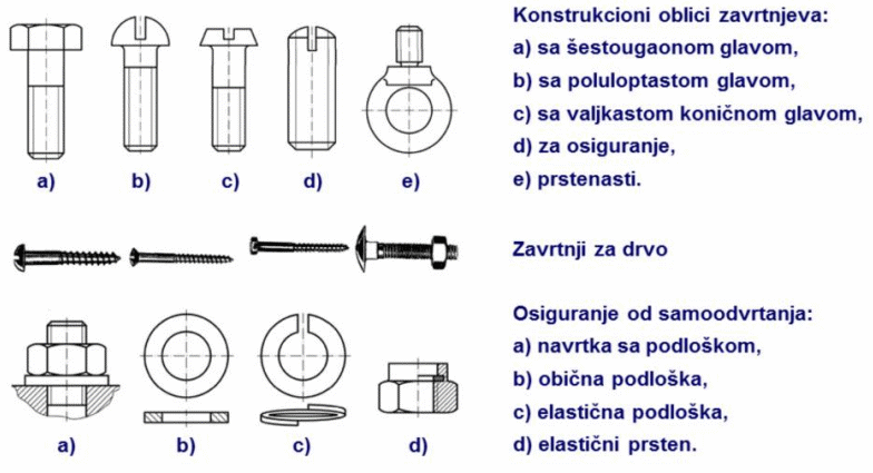 Konstrukcioni oblici i dimenzije zavrtnja i navrtke su definisane međunarodnim i nacionalnim standardima. Zavrtnji mogu biti vrlo različitih standardnih konstrukcionih oblika kako bi se prilagodili potrebama ugradnje. Najčešći konstrukcioni oblik glave zavrtnja je šestougaonik (slika 1 a). Zavtrnji za drvo imaju najčešće konično stablo sa zavojnicom sa razmaknutim profilom. Zavrtnji mogu biti i bez glave (goli zavrtnji), koji imaju samo stablo sa zavojnicom. Ovi zavrtnji se jednom stranom uvrću u ploču pomoću navrtke na drugoj strani, ili spajaju delove tako što na obe strane imaju navrtke.