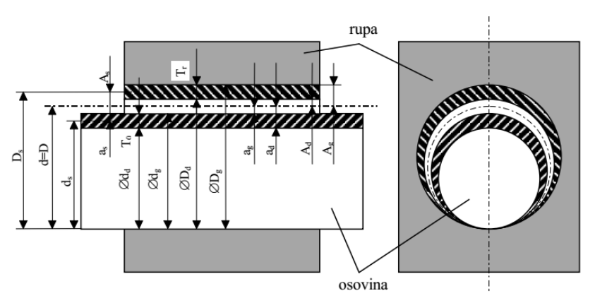 Na slici 2 je prikazan položaj osovine u rupi. U vezi sa oznakama na slici 2, moguće je dati sledeće definicije: