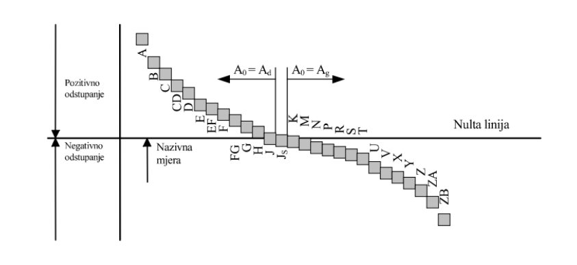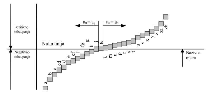 ISO sistem tolerancija i naleganja definise položaj tolerancijskog polja u odnosu na nultu liniju, jednim ili u izvesnim slucajevima sa dva slova, i to velikim slovima za rupe, a malim slovima za osovine. Slika 3 prikazuje odgovarajuce položaje tolerancijskih polja za datu nazivnu meru u određenom podučju nazivnih mera za osovine, a slika 4 za rupe.