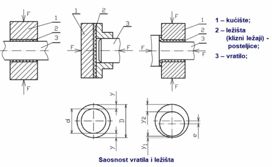Za pravilno podmazivanje je potrebno da su vratilo i otvor ležišta saosni, odnosno da im se ose poklapaju (sl. dole levo), tako da je po ukupnom obimu vratila isti zazor y. U suprotnom, javlja se ekscentricitet e, različite vrednosti zazora y1 i y2 (sl. dole desno) i nemogućnost pravilnog podmazivanja.