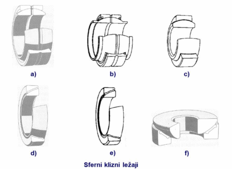 Sferni klizni ležaji se koriste za kompenzaciju nesaosnosti vratila i otvora ležaja. Mogu biti sferni za radijalna opterećenja, dvodelni (sl. a, b) i jednodelni (sl. c). Sferni klizni ležaji sa kosim dodirom se koriste za radijalna i aksijalna opterećenja (sl. d, e, f).