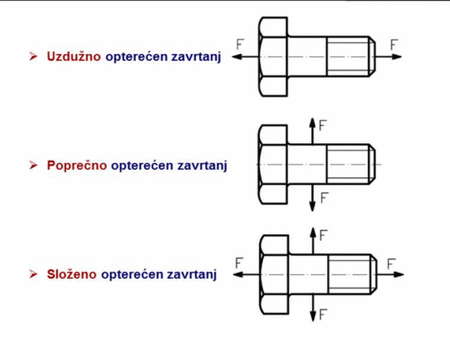 pod nekim uglom na uzdužnu osu stabla – složeno (kombinovano) opterećena zavrtanjska veza, kada se opterećenje (sila) razlaže na uzdužnu i poprečnu komponentu, tako da na zavrtanjsku vezu dejstvuje više opterećenja u različitim pravcima.