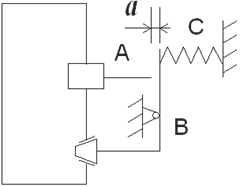 3.2 Vrh poluge dužine 1 cm termostata (A), na parnom kotlu , udaljen je od poluge ventila sigurnosti (B) za zazor a=0,1mm. Pri porastu temperature u kotlu poluga (A) se izdužuje i pomera polugu (B) nasuprot sile u opruzi (C), koja je tako podešena da se ventil sigurnosti otvori kada napon u poluzi (A) dostigne vrednost od 20KN/m2. Ako su karakteristike poluge (A) α=2•10-4 1/K° i E= 2•106 N/m2, izračunati koliko treba da poraste temperature u kotlu, da bi se ventil otvorio.