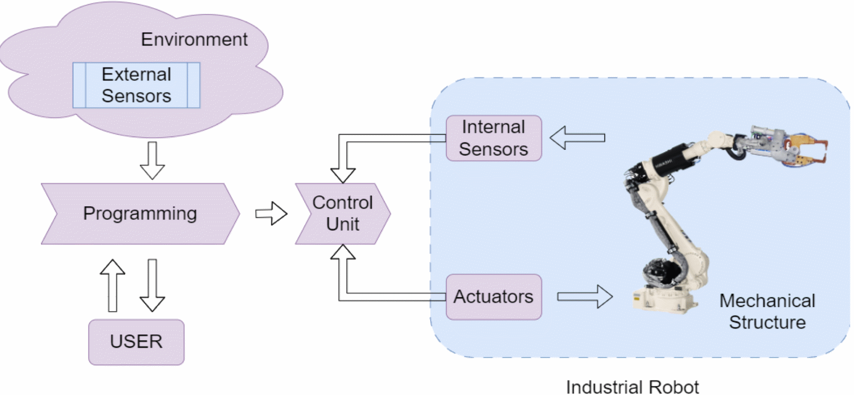 Industrijskog robota možemo posmatrati kao sistem sastavljen od pet glavnih blokova koji rade u organizovanoj petlji: