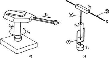 c) Sferna ili RRT-shema,. Minimalna konfiguracija sferne ili RRT- sheme ima tri zgloba od kojih su prva dva rotaciona, a treći translatorni. Na slici 2.6 (b) prikazan je primer sfernog robota i njegova shema. Na slici 2.11 data je još jedna moguća shema sfernog robota. Treća moguća RRT- shema data je na slici 2.18 (a).