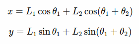 Ako su dužine segmenata L1 i L2, a uglovi zglobova θ1 i θ2, položaj krajnjeg efektora (x,y) se računa kao: