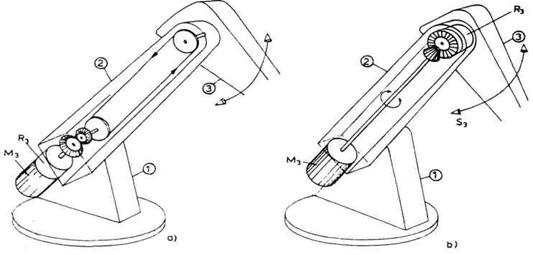 Prvi primer je spoj konusnih zupčanika sa lančanim prenosom do zgloba. Pozitivna strana tog rešenja je što je reduktor udaljen od zgloba pa je dinamičko opterećenje manje, ali upravljivost narušena zbog zazora u lančanom prenosu (istezanje lanca). U drugom primeru je reduktor postavljen u samom zglobu i konzolno povezan sa pogonom (manji zazor) ali zbog položaja reduktora, javljaju se veća dinamička opterećenja.