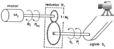 Problem prenosa pogonskog momenta od motora do zgloba je važno i dosta opširno pitanje. Naime, postoji veliki broj različitih rešenja prenosnog mehanizma i nemoguće ih je sve predstaviti. Zato ćemo se ovde zadržati na nekoliko primera koji su relativno često korišćeni. Tako čitalac dobija određenu predstavu o ovom problemu. Kao prvo uočavamo sledeće: motori jednosmerne struje daju male momente i velike brzine obrtanja. Ove pojmove malo i veliko treba shvatiti uslovno. Mislimo da su momenti mali u odnosu na momente koji su potrebni za pokretanje robota, a brzine su velike u odnosu na brzine kojima se obrću zglobovi robota pri nekom uobičajenom kretanju. Zbog ovoga prenosni mehanizam uvek sadrži reduktor koji u određenom odnosu povećava pogonski momenat (na primer i puta) i u istom odnosu smenjuje brzinu obrtanja (takođe i puta). Ovaj odnos naziva se prenosni odnos reduktora, ili stepen redukcije. Najjednostavnija realizacija reduktora je u obliku para zupčanika (slika) čiji su poluprečnici u odnosu i = z1/z2.