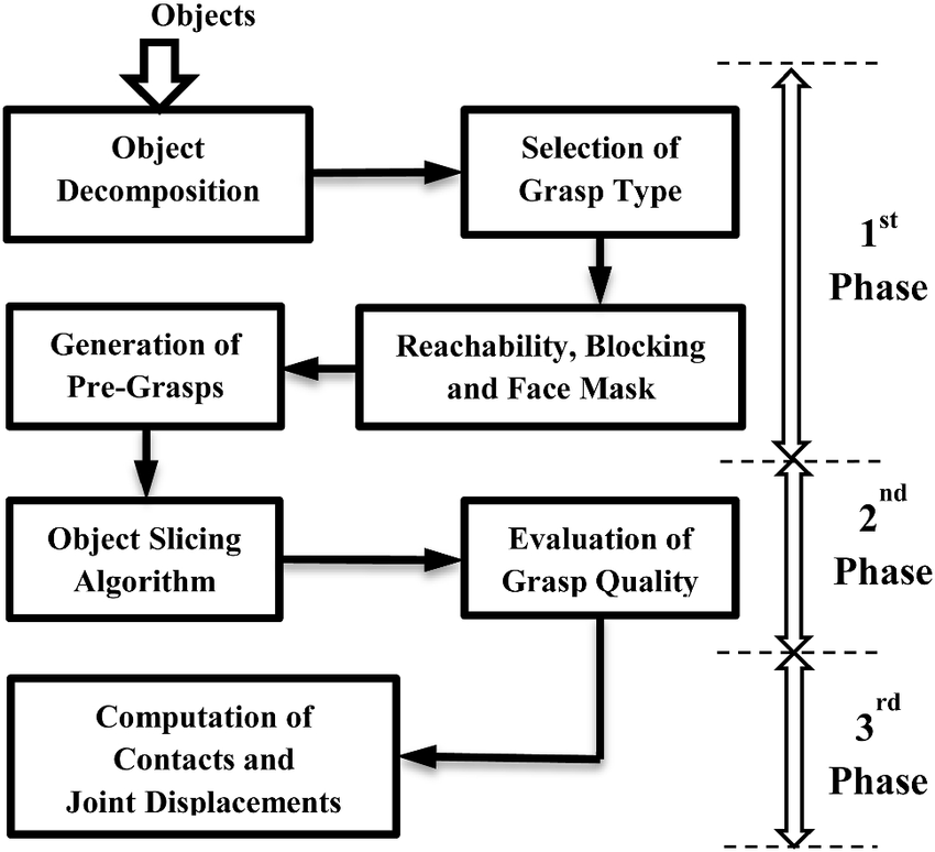 Algoritmi prethodno analiziraju geometriju objekta (point cloud, površinske krive), identifikuju kontaktne tačke, proveravaju force-closure i izbegavaju kolizije ([turn0search4]).