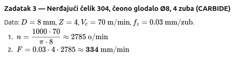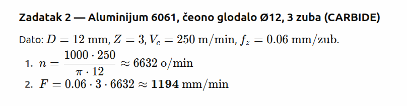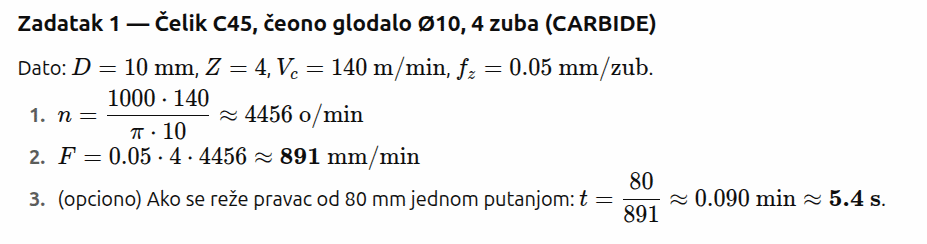Brzina rezanja (Vc): Brzina kretanja rezne ivice alata u odnosu na obradak, u m/min. Usvaja se prema materijalu (npr. za čelik 60 m/min sa HSS alatom).