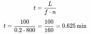 Cilindričan obradak prečnika D=60mm i dužine L=100mm treba se obraditi u jednom prolazu sa posmakom f=0.2mm/obrt. Brzina obrtanja obratka je n=800obrt/min. Izračunaj vreme obrade.
